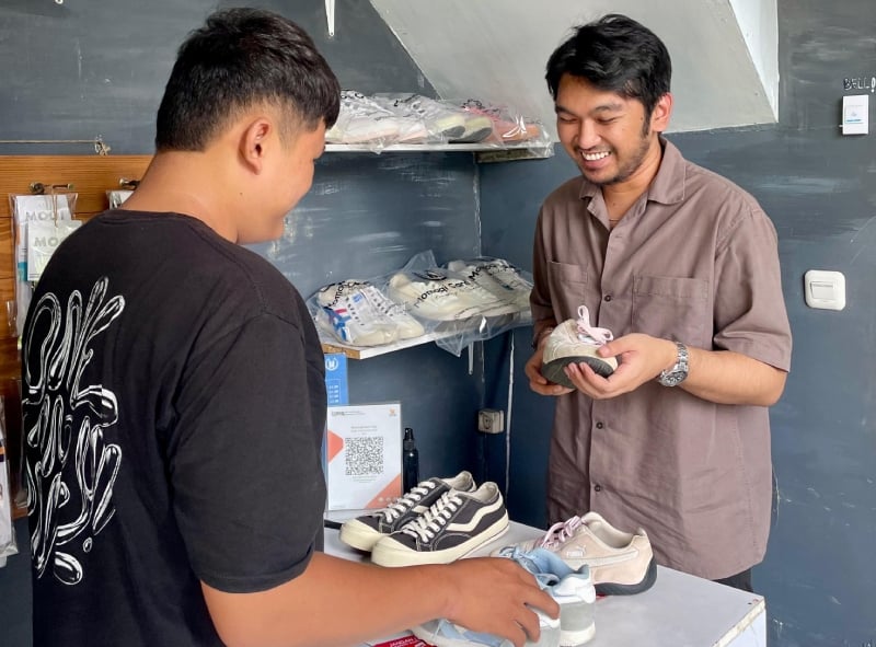 “Ya, kami datang ke café-cafe atau tempat nongkrong anak muda. Bawa mesin pencuci portable dan alat-alat yang dibutuhkan, lalu mencuci sepatu para pengunjung café langsung di lokasi,” ujar Adnan.