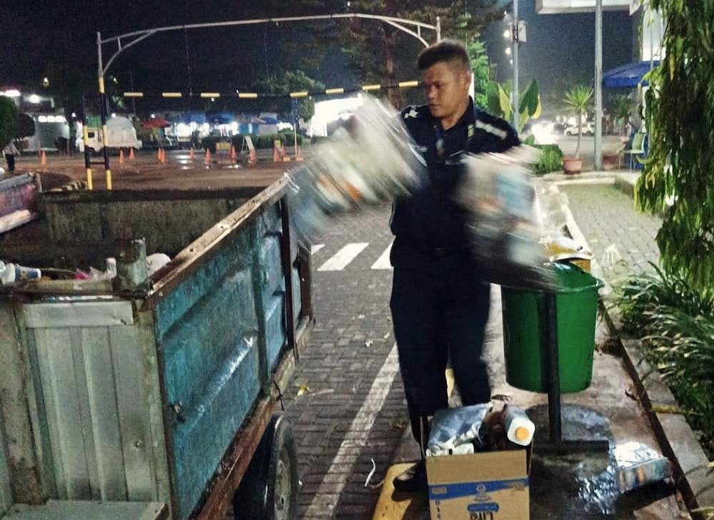 Ojang yang saat itu mendapat tugas di luar ruangan, tak perlu bersusah payah menghindar dari cipratan air hujan seperti kemarin. Dia tampak leluasa mengumpulkan sampah.
